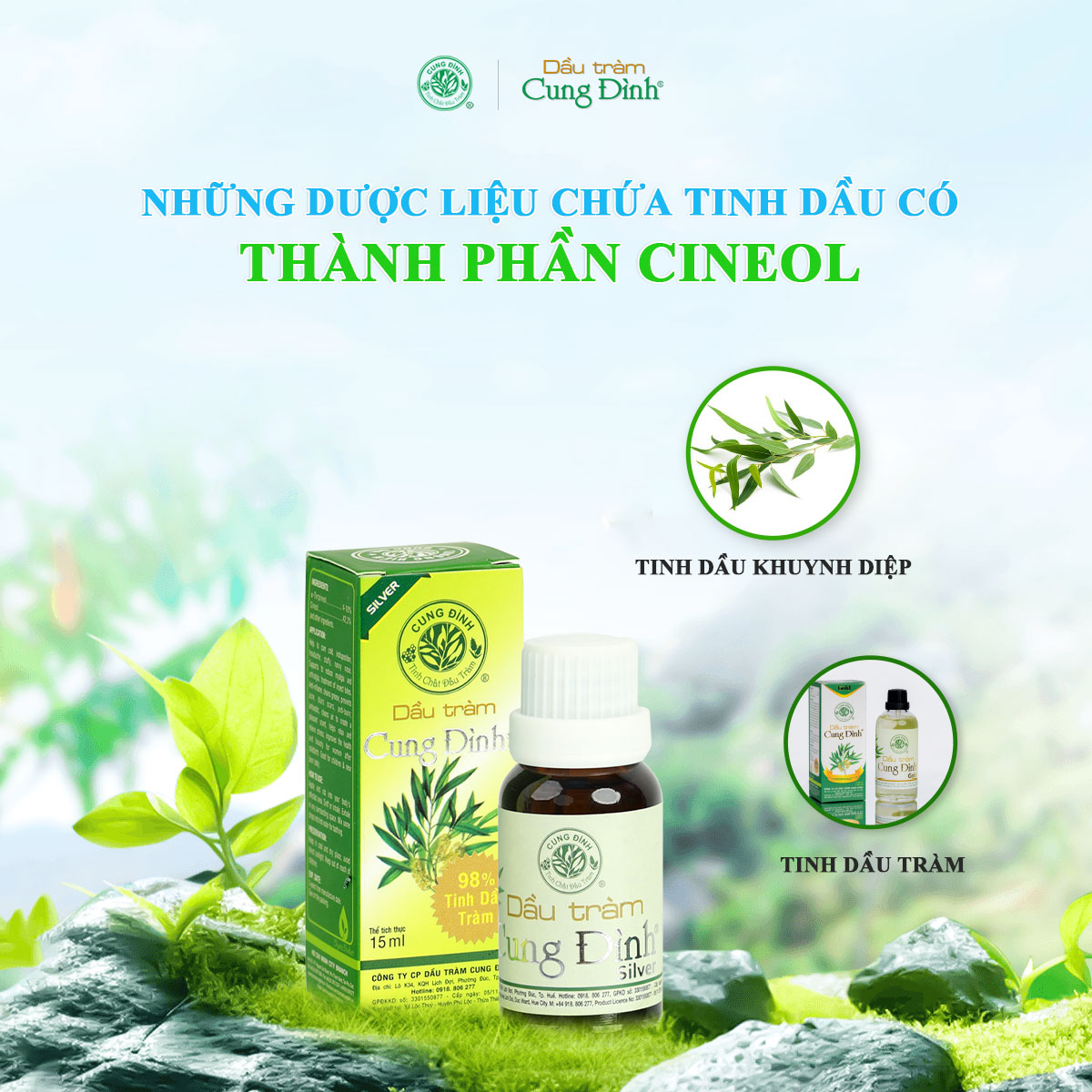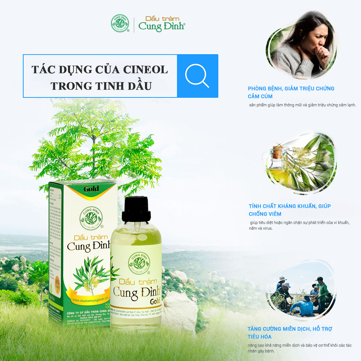 - Sở dĩ nó được sử dụng rộng rãi như trên là nhờ vào đặc tính chống oxy hóa, sát khuẩn mạnh. Hoạt chất này có khả năng làm lỏng chất nhầy, giúp đường hô hấp được thông thoáng, đồng thời có công hiệu giảm đau và giảm sưng tấy tại chỗ tiếp xúc. Nên Cineol thường được ứng dụng và đóng vai trò quan trọng trong các thuốc trị ho, trị các triệu chứng trên đường hô hấp khác và cả nước súc miệng.
