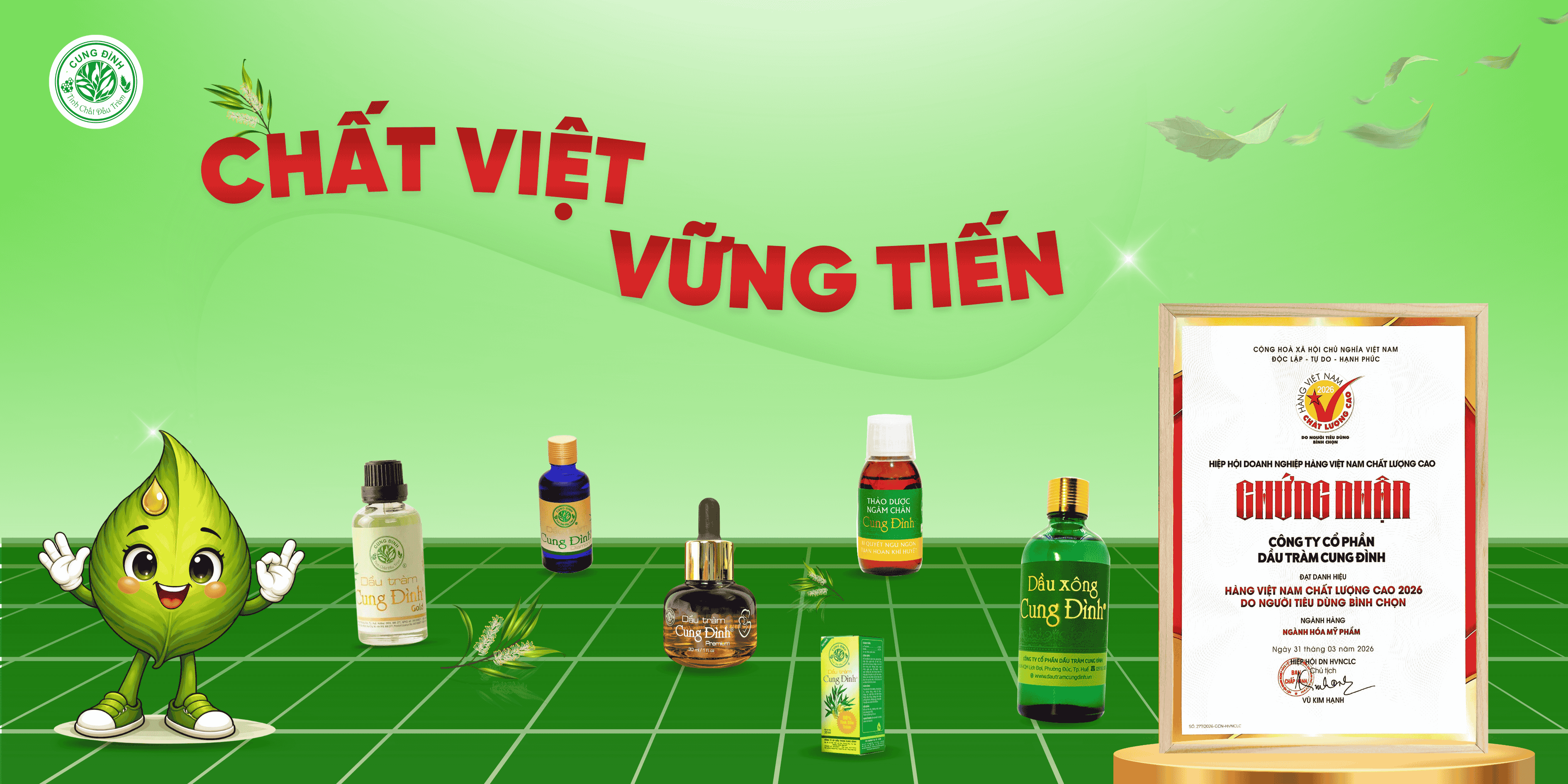 Tại Lễ Công bố doanh nghiệp Hàng Việt Nam Chất Lượng Cao năm 2026 được Hiệp hội Hàng Việt Nam Chất Lượng Cao tổ chức ngày 31/03/2026, Công ty CP Dầu tràm Cung Đình vinh dự đạt chứng nhận "Hàng Việt Nam Chất Lượng Cao 2026" do người tiêu dùng bình chọn. Đây là cột mốc đáng nhớ, khẳng định vị thế của Cung Đình trong hành trình gìn giữ di sản tràm gió Phú Lộc và mang đến giải pháp chăm sóc sức khỏe xanh, an toàn cho hàng triệu gia đình Việt.