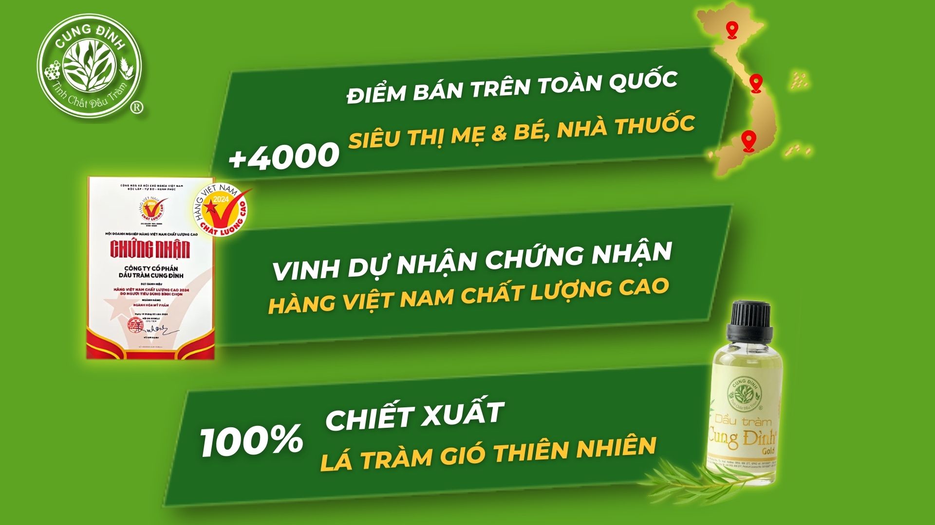 Đứng trước thị trường tràn ngập sản phẩm tinh dầu với chất lượng không đồng đều, Dầu Tràm Cung Đình nổi bật như một thương hiệu uy tín, được hàng triệu gia đình Việt tin dùng để chăm sóc và bảo vệ sức khỏe. Sự khác biệt của Dầu Tràm Cung Đình đến từ những cam kết vững chắc về chất lượng: