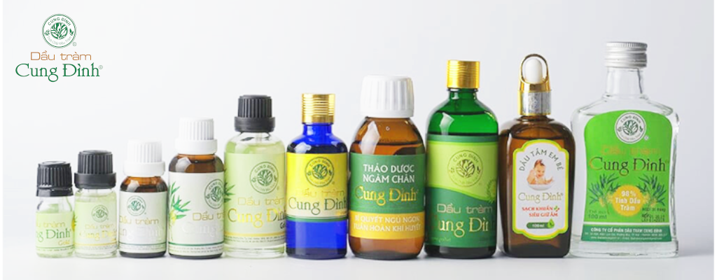 Tại Dầu Tràm Cung Đình, ngoài tinh dầu tràm ra còn có dầu xông, nước rửa tay khô, dung dịch sát khuẩn, dung dịch xịt họng, dầu tắm em bé, thảo dược ngâm chân… Tất cả các sản phẩm dầu tràm Cung Đình đều được Cục Sở hữu Trí tuệ cấp bằng chứng nhận và an toàn đối với sức khỏe nên cha mẹ hoàn toàn có thể yên tâm để sử dụng cho bé yêu của mình.